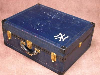 Attractive team trunk is a solid 26x20x10". All Yankee blue with the famed "NY" in white on both sides gives this all the character it will ever need. Even has the original key. From the days of Catfish, Thurman and Reg-gie. EX. From a highly placed Yankee executive and comes with his LOA.