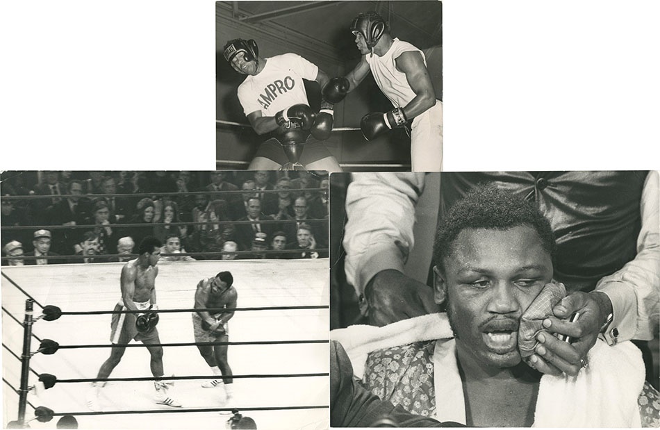 Two spectacular British Daily Mirror press photos are far better quality than their U.S. counterparts. They're double weight 11" x 14" and gorgeous. Ali-Frazier plus 8" x 10" "Cassius Clay" in training for the 1966 Henry Cooper fight.