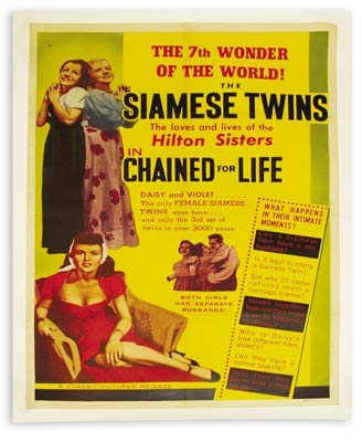 One-sheet for the film Chained For Life, the strange but true story of the Hilton Sisters. These Siamese Twins that starred in Todd Browning's Freaks are shown looking completely abnormal in this cinematic blip. EX, mounted on linen.