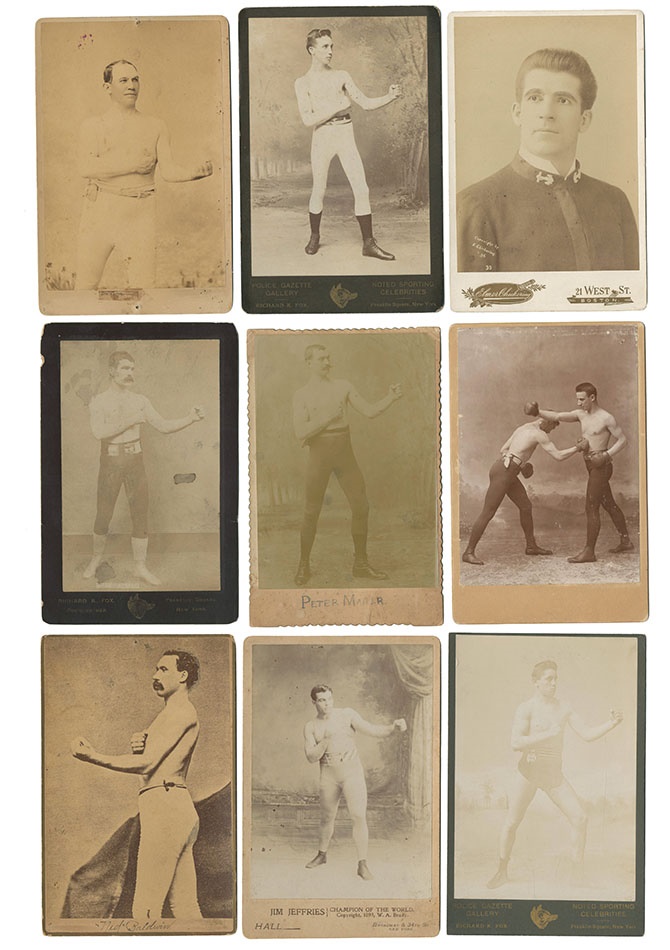 This brilliant group came from a longtime collector and is fresh to the market. The condition overall is VG-EX unless otherwise noted. Police Gazettes include Frank Slavin, Tommy White, and Handler, which is EX-MT. Plus, a beautiful James Corbett by Chickering (EX-MT), Joe Goss (pinholes), Jimmy Dime vs. Tommy Ryan (VG), Ned Baldwin, Tommy Warren, Joe Lennon, Dick Burge (FR), Bill Poole, Peter Maher, and finally, Dan Donley and Austin Gibbons, by J. Wood and Jim Jeffries "Champion of the World" by Hall - EX+ (1899).