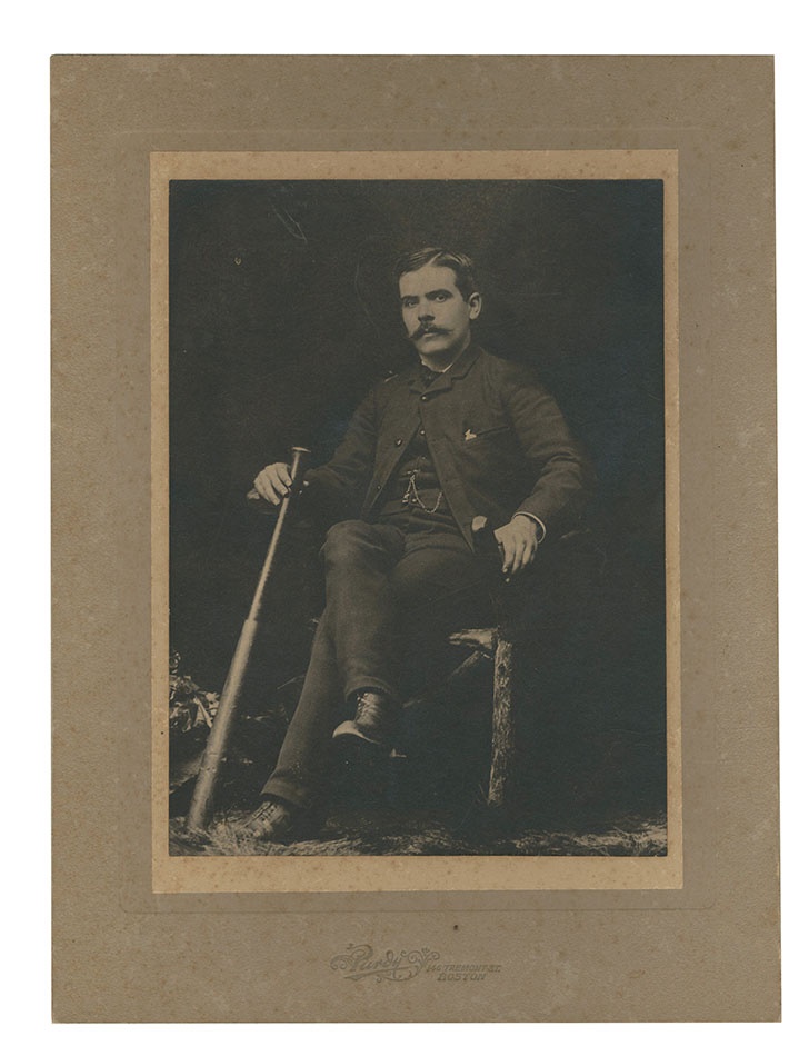 This spectacular oversized cabinet is the only known specimen. The photograph is 6" x 8". Pebbly Jack, a potential Hall of Famer, is seated in an Adirondack stick-art studio chair, dressed to the nines in a three-piece suit with gold watch fob. We wonder if there is a baseball fob or watch on the end and can only dream. Dressed in civvies, resting at his side is his best friend, his trusty bat. The two-toned gem is obviously period and is hammered from game use with spike marks clearly visible. It is very unusual for players in civies to have equipment, making this image special. There's a blind stamp cartouche from Purdy Studio of Boston and llight foxing, but overall EX+. Extremely heavy weight. Overall 9" x 12".