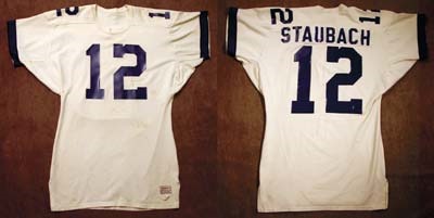The Cowboys had finished the 1975 season with a 10-4 record with thirteen rookies on the squad. They entered the divisional playoff a heavy underdog to the Vikings. With less than two minutes left in a punt-filled defensive struggle, the Cowboys were trailing 14-10 with the ball on their own 9 yard line. Staubach connected on five passes with Drew Pearson, including a clutch 22-yarder on fourth down to keep the drive alive where he made the catch and stepped out of bounds on the 50. Staubach lined up in the shotgun formation. Pearson took off toward cornerback Nate Wright, faked to the inside and then raced for the sideline. Staubach hurled the pass, Wright was running alongside as the slightly underthrown ball came down toward them. There was contact and then Wright was on the ground. The ball came down at the five-yard line in Pearson's hands, he juggled it and trapped it between his right elbow and hip. The referee signaled touchdown. Staubach said later, "I never had a more eerie sensation on a football field than during the aftermath of our touchdown. The crowd was so shocked there wasn't a sound from the stands. It was as though all of a sudden we were playing in an empty stadium. The silance, as they say, was deafening." Later in the locker room he called it a Hail Mary pass -- thrown up as a prayer -- and the name stuck. Offered here is the very jersey the Hall of Fame quarterback was wearing as he shocked the heavily-favored Minnesota Vikings, and the world, as he made the impossible possible. It was grabbed from the Cowboy bench by an N.F.L. sid-edline attendant and stadium worker after Staubach had to change into a security jacket to safely exit the stadium and escape the wrath of violent Vikings fans. The white cotton jersey shows the struggle of that day in marks of impact and a professionally restored tear amidst the number on the chest. Number "12" on chest, back and both sleeves, with "Staubach" spanning shoulders. Tail tagging is from "Southland Athletic Mfg. Co." with "Size 46 L" flag tag. Letter of authenticity is from the man who was there that amazing day when dreams were fulfilled and broken in an instant at Metropolitan Stadium in Bloomington, Minnesota. Also included is a letter of authenticity from uniform