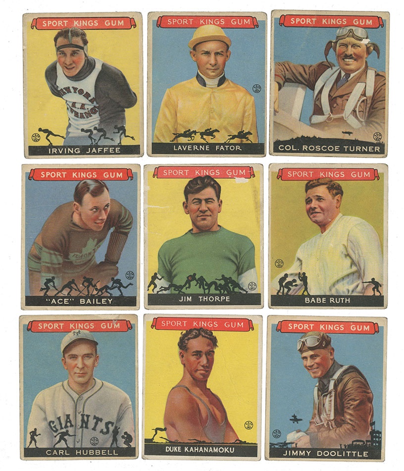 One of the more attractive issues of the 1930s with a bank of athletes to match. Fresh to the market from a foreign country (yes!), the cards average Good only due to some writing on the versos. But visually they have good color and are a pretty bunch. The all-important Babe Ruth is VG-EX (front). Keys include Jim Thorpe, Carl Hubbell, Ace Bailey and famed surfer Duke Kahanamoku.