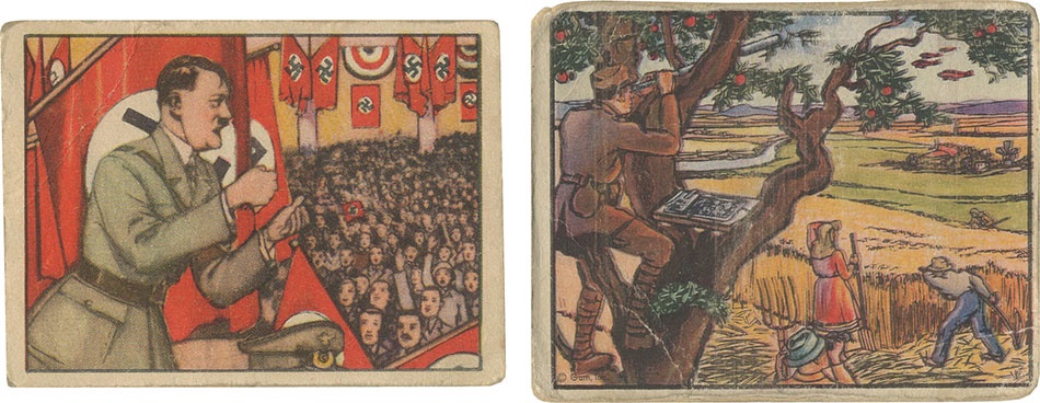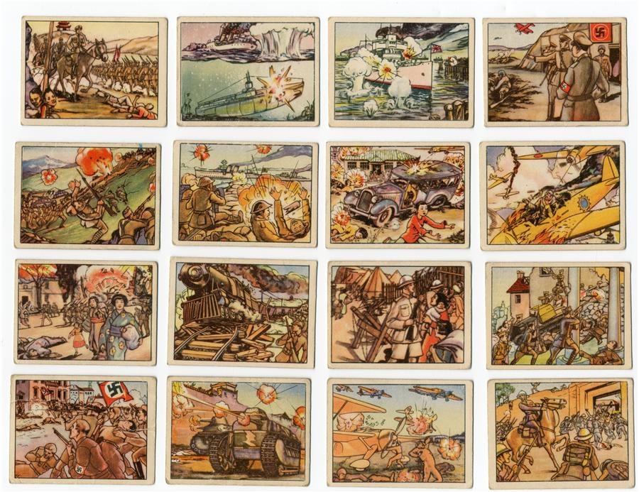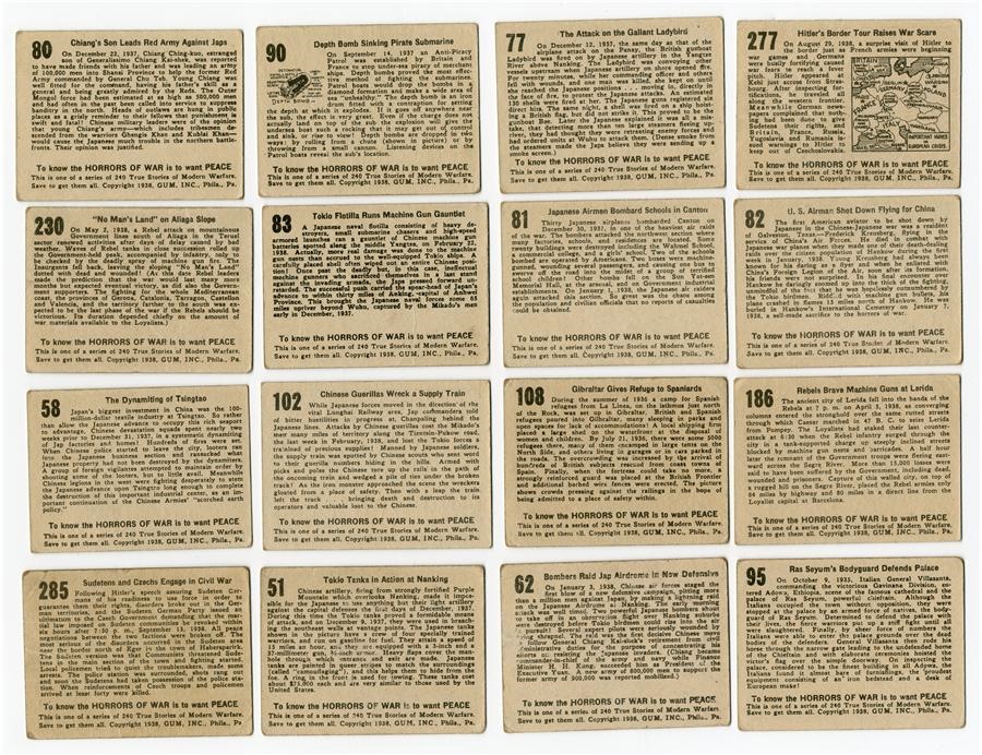 1938 Horrors of War cards are a different size than the American versions of this coveted card set that was recently discovered in Europe. These 38 cards are 1/4" and smaller in size than the typical American versions, but the same stock. They measure 2" x 3 1/8" yet are NOT trimmed and the graphic images of the 1937 Sino-Japanese War are smaller rather than just the white borders. The 38 cards are from all the different series so they likely made a complete set (where are the others?). There are even two "Hitler" cards, #277 and #283, both G-VG. The balance of the cards averages VG. There are other more pedestrian cards in the collection (U.S. issues) including 10 Goudey Indians (FR), 3 U.S. Horrors of War (G-VG) and 2 Thriller Chewing Gum (GD). These came in at a late date before we could research them further or slab them. They are guaranteed to be 100% authentic and vintage. Note: There is a scan below showing the size differential of the two Horrors of War cards.
