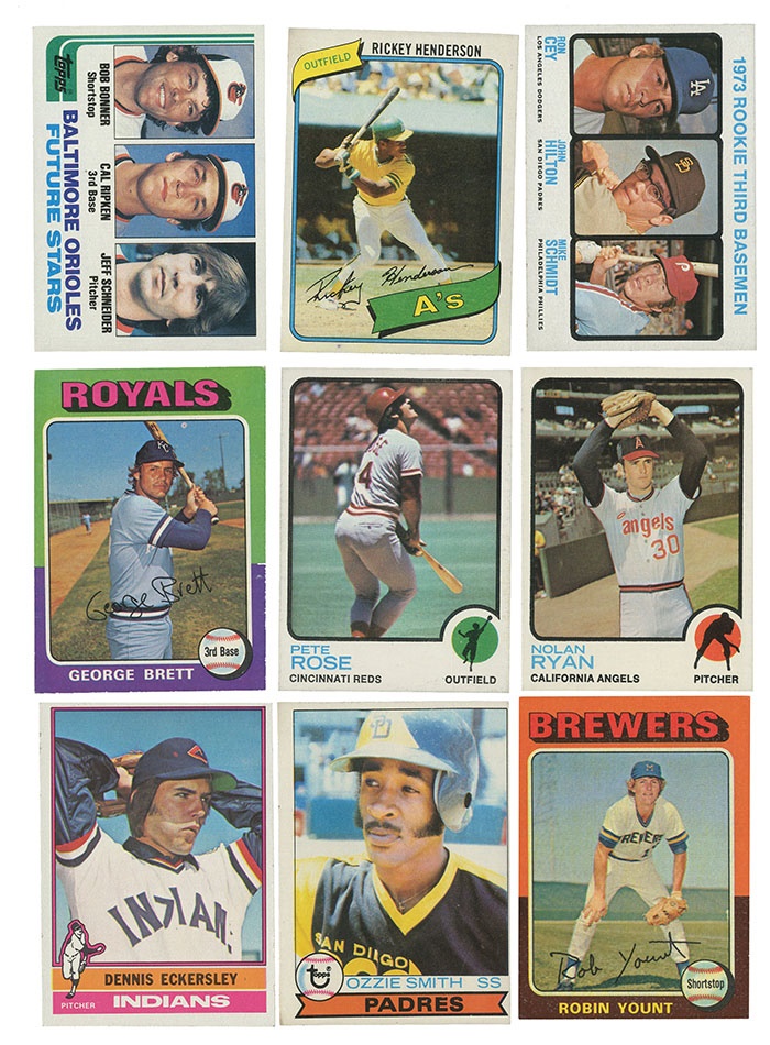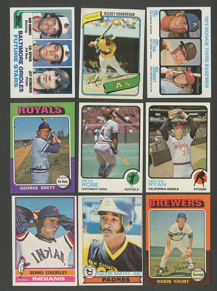 1) 1973T exceptionally fresh NM-MT overall: #50, Clemente NRMT, #100 Aaron NM-MT, #130 Rose, NM-MT, #142 Munson NRMT, #174 Gossage NM-MT, #220 Ryan NM-MT, #380 Bench NRMT, #614 Evans NRMT, #615 Schmidt NRMT. 2) 1974 EX-MT overall: #10 Bench EX, #20 Ryan EX-MT, #130 Jackson EX, #283 Schmidt NRMT, #300 Rose NRMT, #456 Winfield EX. 3) 1975 EX to EX-MT: #223 Brett EX, #228 Yount EX+, #500 Ryan EX-MT, #616 Rice VG, #620 Carter EX. 4) 1976 EX-MT: #98 Eckersley EX+, #240 Rose EX-MT, #330 Ryan NRMT. 5) 1977 EX-MT overall: #144 Sutter EX-MT, #273 Dawson EX-MT, #476 Murphy NRMT, #650 Ryan EX. 6-15) 1978 NRMT: #36 Murray PR; 1979 NRMT: #116 Smith EX-MT; 1980 NRMT: #482 Henderson EX-MT; other sets 1976 SSPC; 1981T; 1982D; 1982 F; all NRMT.