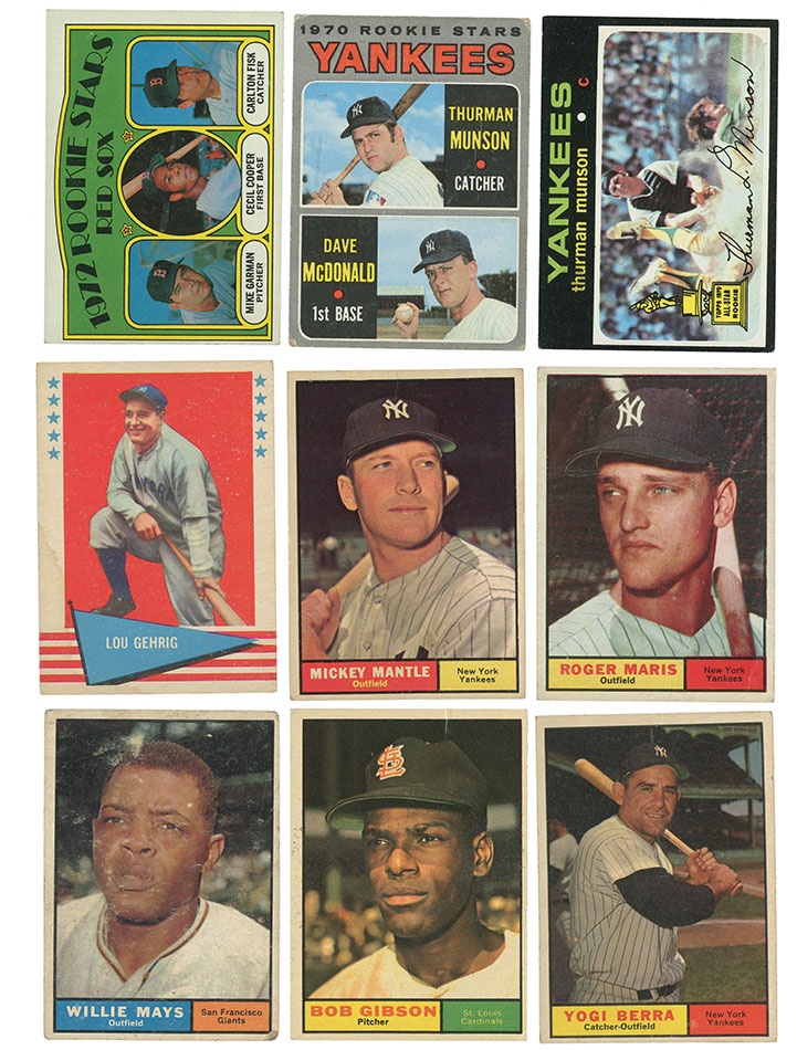 Large collection of cards begins in 1951 and runs into the 1990s. Grades range from PR to MT. Included herein are quantities of Bowman, Topps and Fleer issues from all years. Also included are 25 sets of 1933 National League All-Star cards which have no manufacturer designation but are probably from the 1970s. Highlights include 1961 Mickey Mantle #300 EX, #2 Roger Maris, GD, #150 Mays GD; 1970 #79 Thurman Munson VG; 1971 #5 Munson EX, and 1972 Fisk #79 EX.
