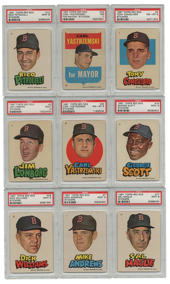 1967 was an amazing year for the Red Sox, going all the way to the World Series with Triple Crown Winner Carl Yastrzemski leading the charge. This test issue features head shots of players with large colorful lettering and are relatively tough to find. The set breakdown is as follows:PSA 9 MINT 5, 7 , 9, 11, 13, 16, 17, 18, 20, 22, 23, 24, 26, PSA 8.5 NM-MT + 10, 31 PSA 8 NM-MT 2,3, 4, 6, 8, 12, 15, 19, 21, 25, 27, 32, PSA 7 NRMT 29, 33 PSA 6 EX-MT 1. Missing Cards 14, 28 and 30.
