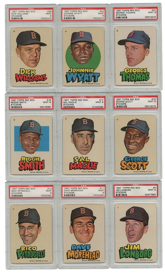 Tough test issue is quite attractive with Red Sox colors and a comic book cover look to them. Nice accumulation includes 16 PSA 9's and 42 PSA 8's, 11 PSA 7's, 14 PSA 6's, and 8 lesser. Top stars from Topps includes three Conigliaro #3 PSA7, PSA8, PSA8: two Yaz #25 (2) PSA5, PSA4: two Yaz for Mayor #29, PSA7, PSA2. This tough Topps test issue was only released in Boston and Pittsburgh.