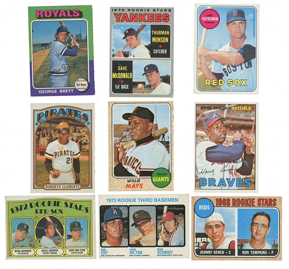 This is simply an enormous accumulation with the primary concentration of cards between 1967 and 1972. The 1967s contain 30 high numbers. Average grade for the collection is EX-MT throughout with many NRMT and NM-MT examples. Mixed in are stars and leader cards that include 1967 #250 Hank Aaron NRMT, 1968 #50 Willie Mays EX-MT, #207 Bench EX, 1969 #130 Yastrzemski NRMT, 1970 #189 Munson EX, 1972 #79 Fisk EX, 1972 #309 Clemente EX, 1973 #615 Schmidt EX-MT, and 1975 Brett #228 EX.