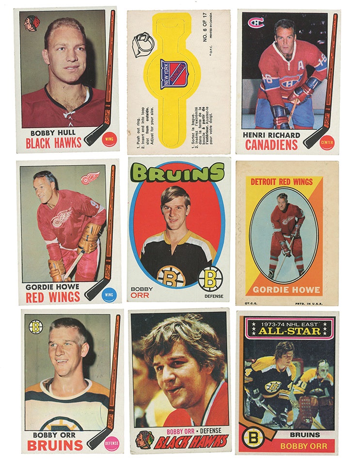 Most of this collection dates from the late 1960s to the early 1970s. Half of the cards are the highly sought-after 1969-70 Topps Hockey. There is even a handful of 1980s Wayne Gretzky cards. The average grade is EX-MT with many NRMT examples. Highlights: Bobby Orr (1970 EX-MT, 1971 EX, 1974 AS EX, 1977 VG-EX), Howe (1969 EX, 71 EX, 1970 Sticker VG), and Bobby Hull (1969 EX).
