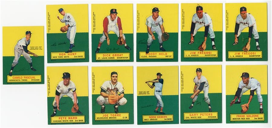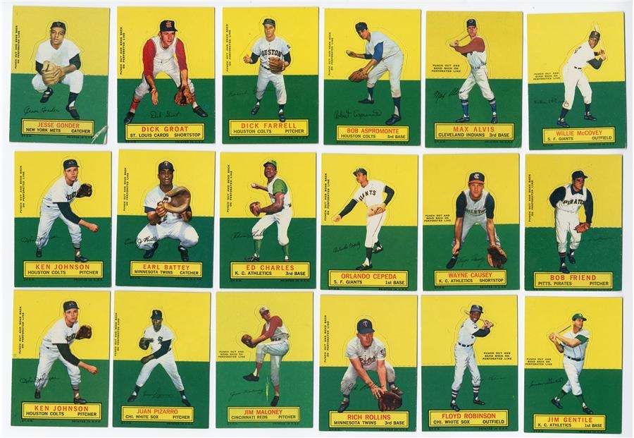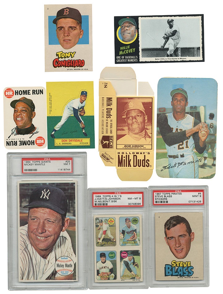 Everything but the kitchen sink here: 1964 Topps Stand-Ups (31), 1967 Red Sox Star stickers (41), 1968 Topps Game (100+), 1969 Transogram (16 well cut), 1969 Topps Deckle Edge (45), 1964 Topps Giants (75+), Coke Bottle Caps (28), 1971 Great Moments (2), 1962 Post Cereal (100+) and more. Also includes 1964 Topps Stand-Ups original art for the Frank Malzone card, several Johnston Cookies, Bell Brand unopened pack with Wally Moon and a 1969 Topps Four-In-One PSA8. Legendary players represented here include Mantle, Mays, Clemente and many, many more. Please view the website for additional photos as there are lots not to be missed. From a mad collector specializing in odd-ball who was also very condition-conscious.