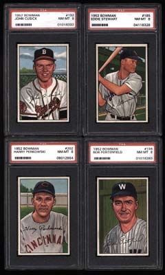 This is a great way to upgrade your 1952 Bowman set! The lot includes the following PSA 8's: Eddie Stewart, #185, John Cusick, #192, (2) Bob Porterfield, #194, Ted Gray, #199, Harry Perkowski, #202, Steve Gromek, #203, and Elmer Valo, #206. These have that pack fresh "look". These are all PSA 8's with no qualifiers.