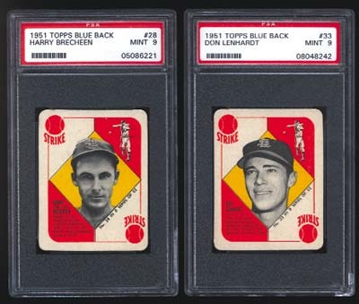 In 1951 Topps produced a base-ball card game with red and blue backs. The blue backs are much scarcer than the red backs. This lot contains a pair of gorgeous PSA 9's from the set: St. Louis Cardinals Don Lenhardt #33 and Harry Breecheen #28.