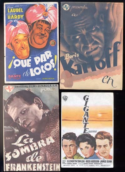 This collection of fabulous full-color advertising handbills is from Spain. These were given out to promote the films' releases. This collection took years to build. Some of the great-est artists of Spain worked under the oppressive reign of Franco on these. Many of the best are from the 1940's. In addition to those pictured are Son of Frankenstein, several Abbott & Costello, several Alfred Hitchcock, different version of Gone with the Wind, Bogart, Lucille Ball, several Horror, Marilyn Monroe, Ingrid Bergman, Disney, Film Noir, Monty Clift, Elvis, lots of Sid & Marty Croft, Bette Davis, Gary Cooper, Shirley Temple, and so many more. Most 4x5" thru 6x9". Many of the older ones open like a program and there are some duplicates. Average EX. No junk!