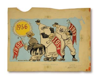 Two-page center spread from the long coveted 1956 Manufacturer's Hanover baseball schedule. Pen & ink has been personally hand colored by Mullin in what appears to be an acrylic on artist's board. Tantalizing image shows the famous mascots the New York "Yankee," New York "Giant" and Brooklyn Dodger "Bum." Holding their respective championship year pennants (1953-55), they are gazing long-ingly at the blazing yellow sun of "1956." The 1950s Manufacturer's Hanover Bank schedules are per-haps Willard Mullin's finest work. They represent the peak in the career of the Dean of America's sports cartoonists. The only original piece extant let alone the most desirable of all, the double page center spread. EX+. 14x12".