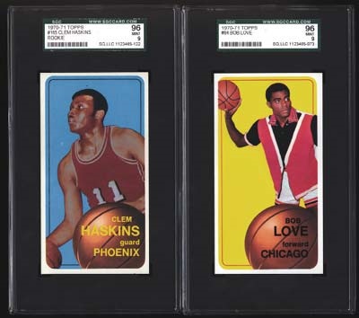 SGC Cards This is only the second NBA set that Topps ever produced. All 21 cards in this lot have been graded by SGC. These are cards are difficult to find in SGC 88 (PSA 8) or higher because they are oversized and were hard to take care of. The lot breaks down as follows: SGC 96 (Mint) - Clem Haskins Rookie and Bob Love; SGC 92 (Nm/Mt+) - Nate Thurmond AS, Unsled, Dandridge Rookie, Van Arsdale, and Debusschere Photo Album; SGC 88 (Nm/Mt) - Jerry West, Connie Hawkins, Jack Marin SP, Jerry Sloan Rookie, Checklist, Chamberlin Photo Album, and 3 other Photo Album Cards; and SGC 86 (Nm+) - Jo Jo White Rookie, Stallworth SP, Frazier AS, West Photo Album, and a Rod Thorn Rookie.