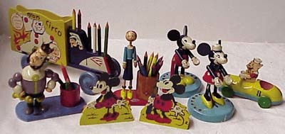 Collection of eight wooden comic character toys was made to pro-mote and sell Faber pencils in the late 1930's. Characters consist of Walt Disney's Mickey & Minnie Mouse, and the Three Little Pigs; Fleischer includes King Bombo from Fleischer's 1939 full-length ani-mated classic Gulliver's Travels, plus Popeye and Olive Oyl. The toys are known pieces and authorized by Disney & Fleischer. Each figure comes complete with the original Faber pencils. These toys are orig-inal store stock. The figural Mickey & Minnie, the Olive Oly and the Pig in the Car are wood jointed (the arms etc. move). The wheels on the cars move. Popeye in the Truck, Olive Oyl, and Pig in the Car have labels, the Pig is a Disney label. Most are 5-6" high. Overall EX.