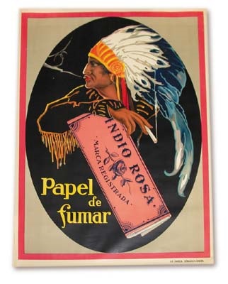 Dazzling image of an Art Nouveau American Indian dates from the turn of the century. He advertises "Indio Rosa" Rolling Papers in vibrant, spectacular colors. 28x40" and NRMT. Would look incredible framed and on your wall.