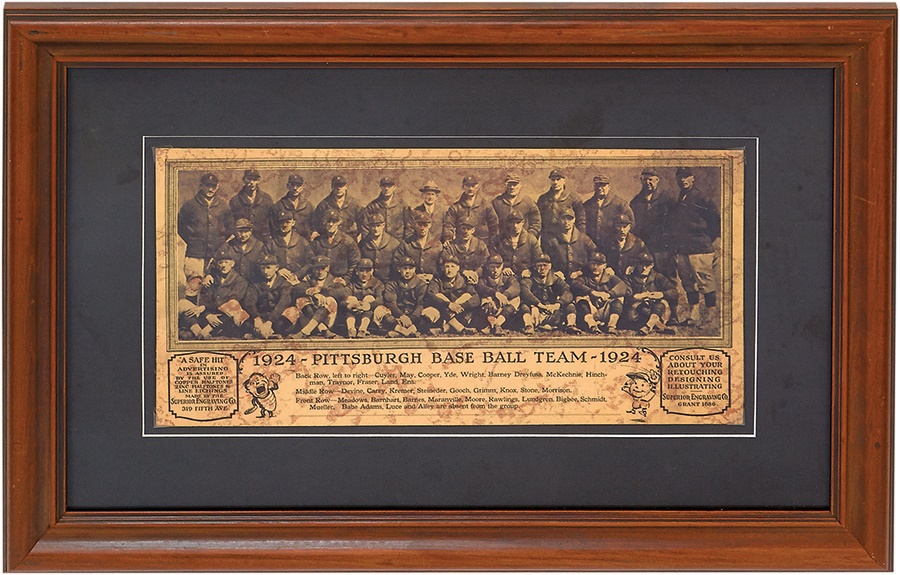 This panoramic image of the team that proceeded the 1925 World Champions is one we have not seen before. The fact that it promotes an illustration and design firm is a blessing. The paper stock is quite special with an extremely unusual and elegant pattern, not unlike golden fingerprints. This is an example of their advertising: "copper halftones." They declare themselves a "Safe Hit in Advertising." Great little classic baseball line drawings decorate the players, who include: Carey, Cuyler, McKechnie, Clarke and Rabbit Maranville. The NRMT print measures 13.75x7" and is nicely framed and matted to 21x14".
