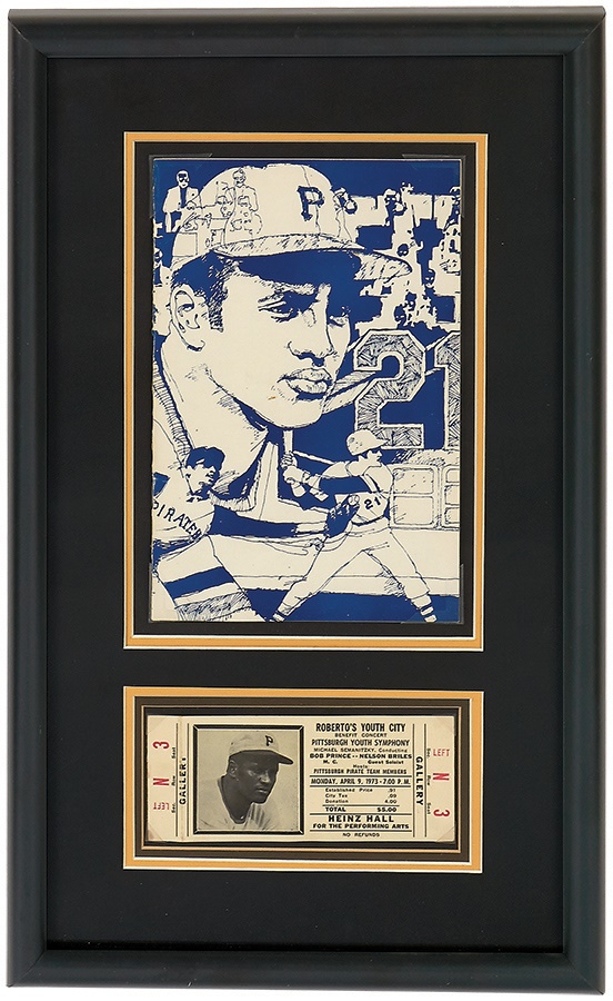Baseball fans of the era can't forget the tragedy of Roberto Clemente, whose life was cut short in a plane crash in 1972 while on a mission of mercy to aid earthquake victims. This item is an unused ticket - which includes an image of the late star - to Roberto's Youth City Benefit Concert, which was held in Pittsburgh in 1973. Comes framed with original program to the concert, which featured Pirates announcer Bob Prince as M.C. & Nelson Briles as guest soloist for the Pittsburgh Youth Symphony. The ticket has a crease, while the program is in NM condition.