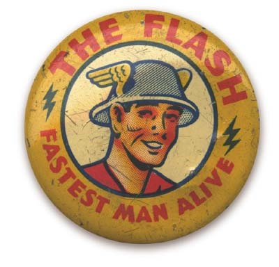 Early 1940's "Fastest Man Alive" pin pictures this speedy DC comic character. Comic book premium pin is scarce. Metal litho pin has a tiny dent, o/w EX+. 1".