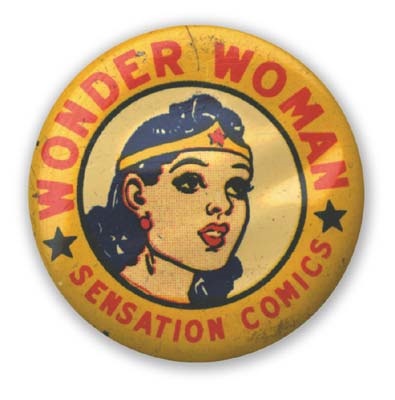 Early 1940's "Sensation Comics" advertising pin pictures this Amazonian Princess and DC Comic Book character. Comic book premium pin is quite scarce. Metal lithographed pin has a tiny dent, o/w EX.