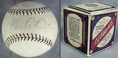 This is a great one for a couple of reasons. First, it is in Near Mint condition. Second, it was signed at the pin-nacle of Ruth's career, circa 1928. Clean and pure "Babe Ruth" signature on the sweet spot in blue fountain pen. The "Babe" is in quotes, a practice that Ruth only used with consistency until 1928. The ball is an Official American League (Barnard) model with great stamping and a consistent off-white coloring. This beau-ty even comes with its original box. A truly great example of an early Ruth single signed ball.