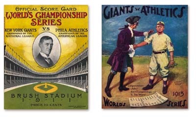 Pair of programs each detail October meetings between the N.Y. Giants and the Philadelphia Athletics. Each is Good with spine sepa-ration despite vintage tape repair. They aren't beautiful, but they're complete (1911 is missing back cover) and very rare. Each is pencil scored as well, so you can be sure they were there to witness great-ness. And isn't that what matters?