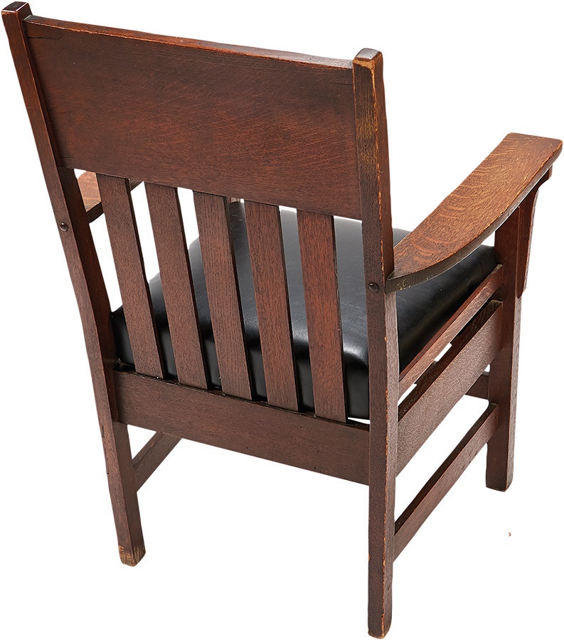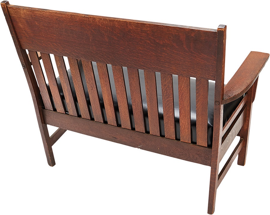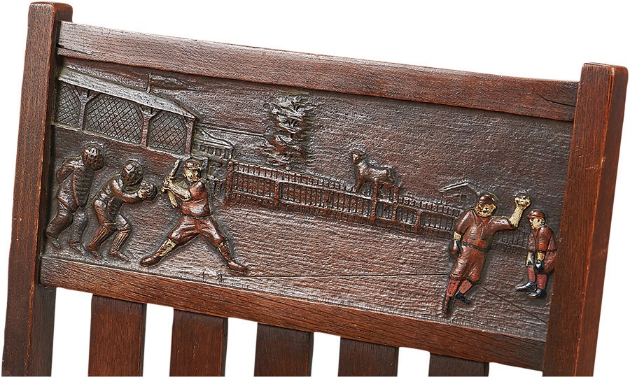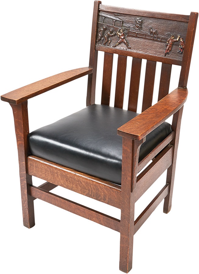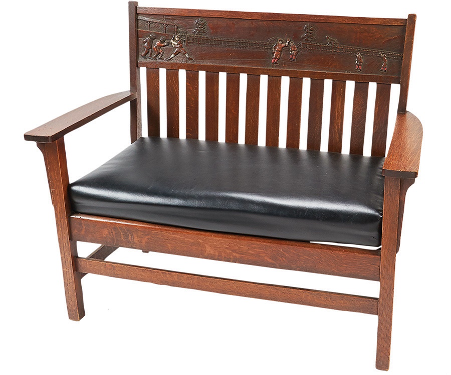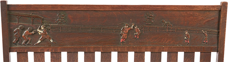 From a century ago, this early mission furniture from the Stickley era is a home run wherever it may wind up. There are two pieces in this oak set - both house-ready - with the top rail of both depicting baseball scenes carved in the wood. The original paint has been retained whereas almost all the similar pieces we have seen do not. As an added attraction, the original cushions are also included and have been re-covered in black leather. The only TRUE Baseball furniture you will come across, with the same baseball scene illustrated on both the armchair and the bench (greater scope on the latter). Specifically, a pitcher deals to a batter with a catcher and umpire situated behind the plate. There are three defensive players on the left side of the field, with a border fence surrounding the players and comprising the left side of the park. Beyond the fence is an actual bull in a pasture (the first "bullpen" perhaps?), which adds a very nice touch to the pastoral, summertime feel. The chair, which measures 26x38x24.5", has two small stress cracks along the top rail. The bench measures approximately 46x37x24.5". Mission was simple furniture built to last... and last it has.