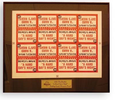 From the famed Topps auction, this uncut sheet of A Hard Day's Night cards are an uncut proof sheet of 16. These were the header cards that were attached to the top of packs of gum cards.