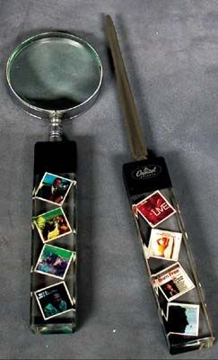 The rare and sought after two-piece desk set consists of a Lucite letter opener and wand style magnifying glass. Each han-dle is embedded with miniature albums for the Beatles' Sgt. Pepper, the Beach Boys' Pet Sounds, and many others. NRMT.