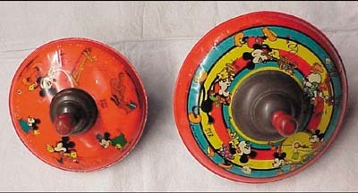 Here is an excellent example of 1930's tin lith-ograph spinning top toys manufactured by Ohio Art Corp. They are marked Walt Disney Enterprise and will supply hours of old fashioned fun. 8" and 10". VG+.