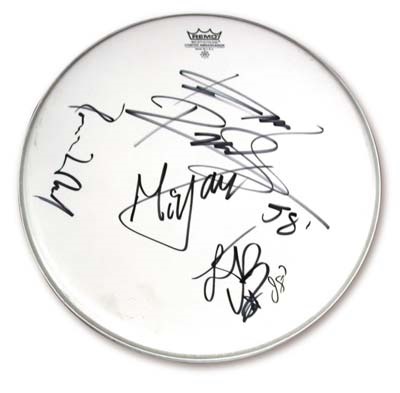 A 15" Remo weatherking coated tom-tom head is signed in black marker by Keith, Ron, Mick and Charlie. NRMT.