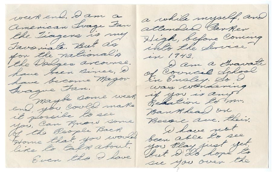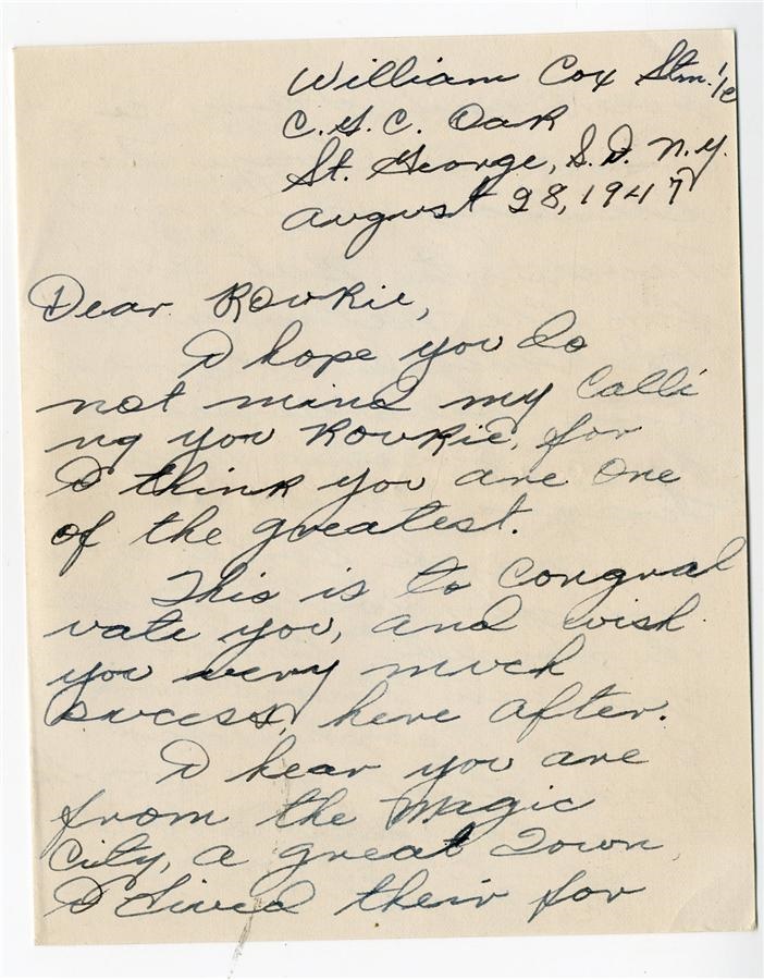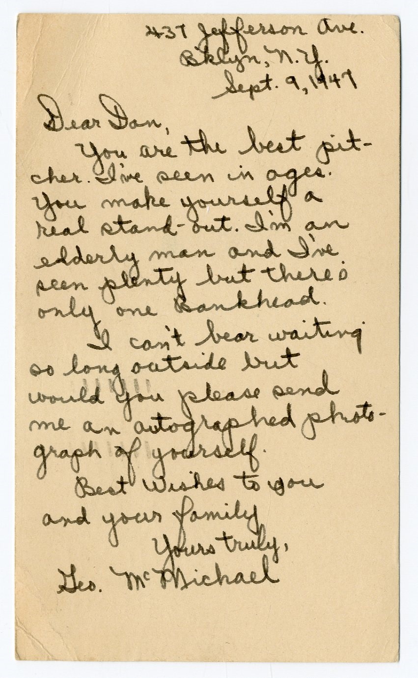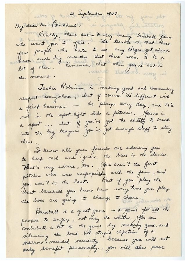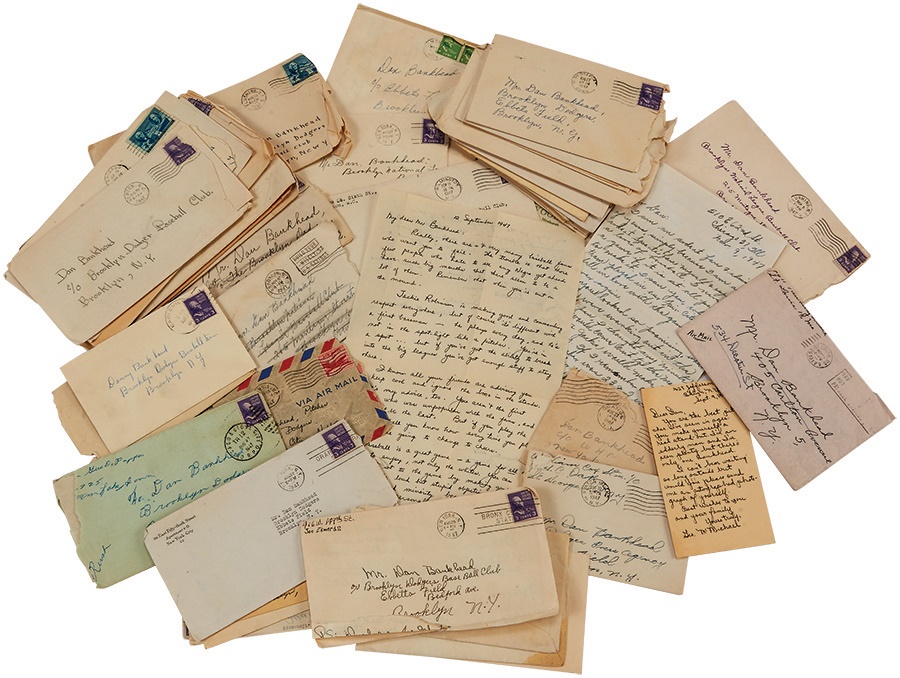 Four months after Jackie Robinson broke the major league color barrier in Brooklyn, 24-year-old negro leaguer Dan Bankhead became the big leagues' first black pitcher, also with Brooklyn. This lot commemorates the historic achievement as there are five-dozen letters and Postcards congratulating Bankhead. The content is mostly congratulatory, with many autograph requests. Several of the correspondence are from African-American fans and most retain their original mailing envelopes.