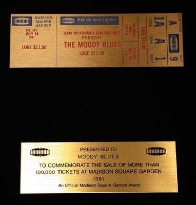One in a series of gold ticket awards to commemorate the sale of 100,000 tickets sold at Madison Square Garden in 1981. Presented to the Moody Blues and housed in a wooden frame. NRMT. (10x12")