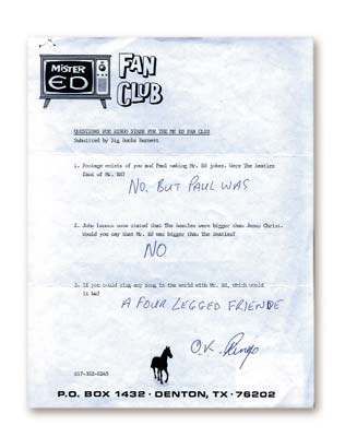 On official Mr. Ed Fan Club stationary. Ringo actually filled out his question sheet for the fan club. Ringo states that Mr. Ed was not bigger than the Beatles and Paul was the Mr. Ed fan. A fun and cool piece.