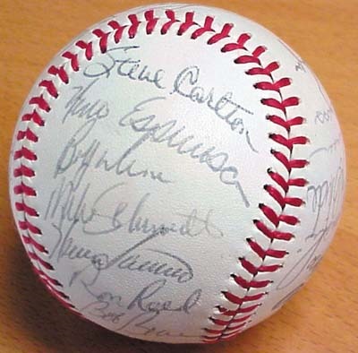 The World Champs! ONL (Feeney) ball has no shortage of star power, with twenty-six EX-MT or better signatures including Rose, Schmidt, Luzinksi, Boone, Carlton and Bowa. Now that's a team!