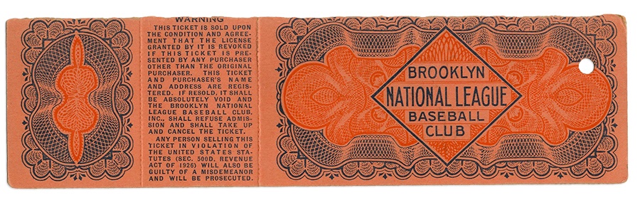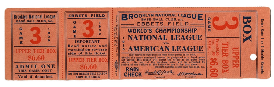 DOH! Not only did Brooklyn not make the World Series in 1930, the team finished fourth in the National League behind St. Louis. This phantom ticket is for Game 3 of a fall classic that was never played at Ebbets Field. It is trimmed at the bottom but otherwise in EX+ condition. This is the first of its kind that we have seen.