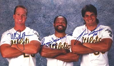 There was some serious home run power packed into these burly arms as the hard-slugging trio shared the diamond in Oakland. Blue sharpie signatures from each are NRMT.