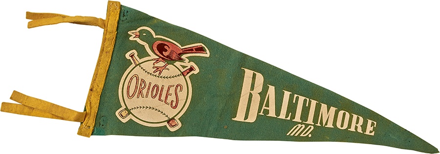 Very tough and early piece, looks at the early Major League logo. This is actually a "travel" pennant crossover, as it sports the city and state. Pinholes, otherwise EX. 16-1/4" long.