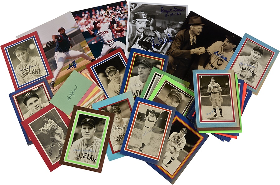 There are two main groupings in this lot: 1) Mostly Jim Rowe postcard photos include H, Becker, J, Becker, Berger, Calvert, Case, Colavito, Edwards, Fleming, Galehouse, Garcia, Gettel, Grimes, Gromek, Haddix, Harper, Hudlin, Hughes, Kamm, Kennedy, Metkovich, Mossi, Peck, Robinson, Rosen, Score, Sewell, Trosky, Weatherly, Webb and Weiland. And: 2) 3x5 cards include H. Becker (3), J. Becker, Bockman, Boyd, Brown, Burchart, Calvert, Case, Chapman, Dailey, Detore, Fleming, Gaffke, Gliatto, Harder (4), Harris, Helf, Hudlin (2), Hughes, Irwin, Kuiper, Lamb, Lemon, McDowell, Mills, Milnar, O'Dea, Stephenson, Susce, Uhle Weigel, Westlake, Whitfield and Winegarner. There are two PSA/DNA LOAs on both lots.