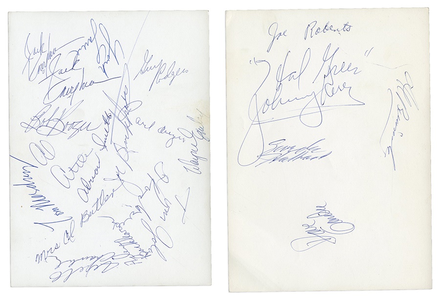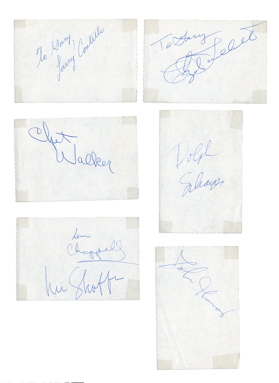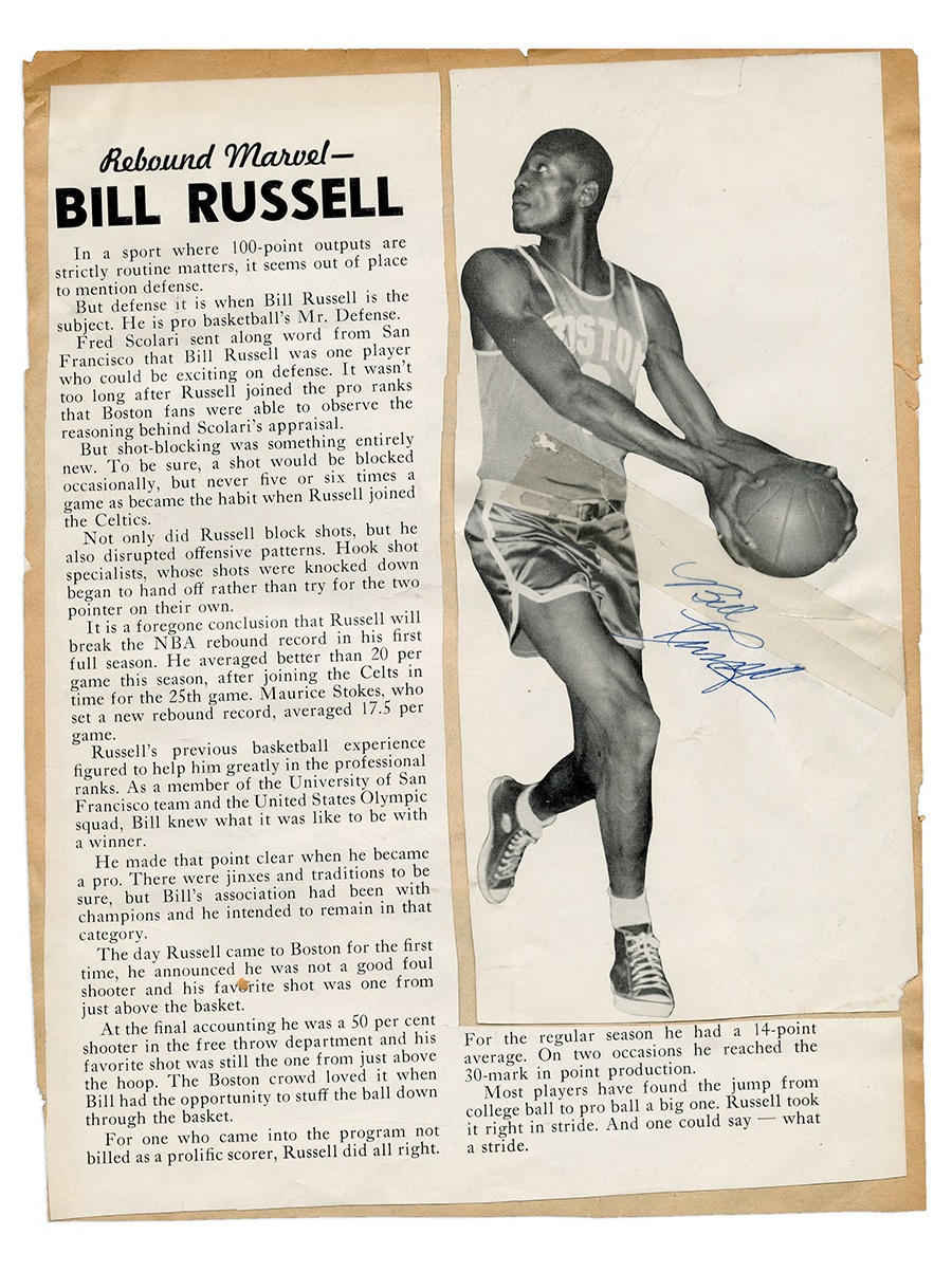 This fine collection of basketball and hockey signatures was obtained by one man in person. Signed pieces include: a Celtics program, photos of Russell (taped) and Cousy, signed photos of Cowens and Heinsohn, and best of all three Celtics photos signed on verso by Greer, Chamberlain, Twyman, Embry, Sanders, Bellamy, Arizin. Signed cuts (singles & multisigned): Havlichek, Sam & K.C. Jones, Richter, Schayes, Nelson, Bellamy, Hagan, Pettit, Sharman, O. Robertson and Phil Gordon (poor). There are about 20 Bruins and Hockey: Howell, Worsley, Johnston, Harvey, Ratele and Schmidt. Total of about 100 signatures, the '50s materials is a bit rough cut from programs, but the others are real nice.