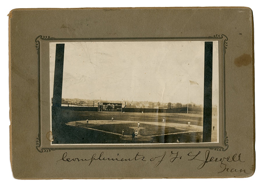 Displayed here is a sport photograph on heavy mount of Braves Field on May 26, 1916. The Giants are in town and the scoreboard is the identifier telling us the games of the day. Two Hall of Famers are shown: Bill McKechnie at third and Hank O'Day as the home plate umpire. The piece is signed "Compliment of G.L. Jewell" with a final word we cannot make out. Secondhand research assistance courtesy of Al Crisafulli and Tom Daley. Overall VG-EX, but clean.