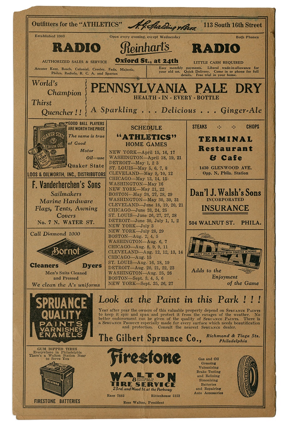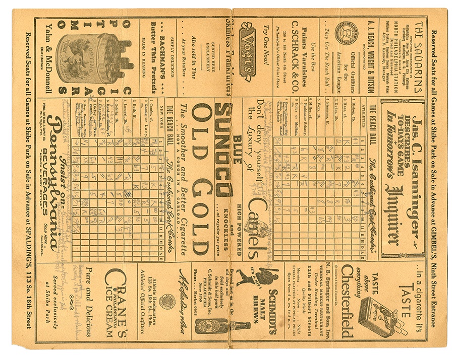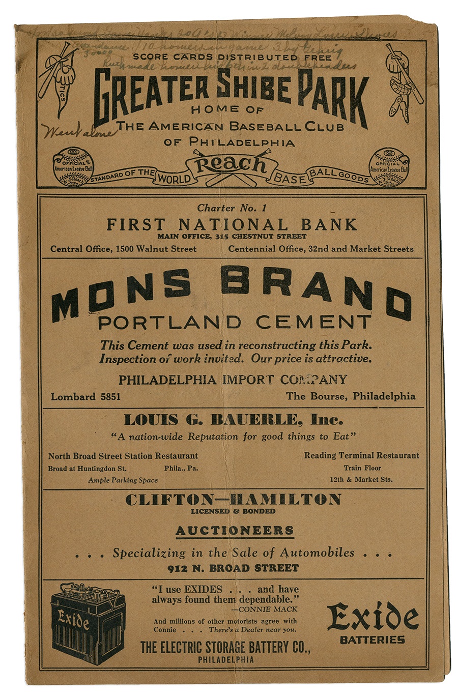 From Shibe Park, this is nicely scored scorecard with descriptive handwriting on the cover in pencil. Lou Gehrig hit three home runs in the second game of this doubleheader and Babe Ruth blasted his third in a row on the same day. There is a center crease but otherwise VG.