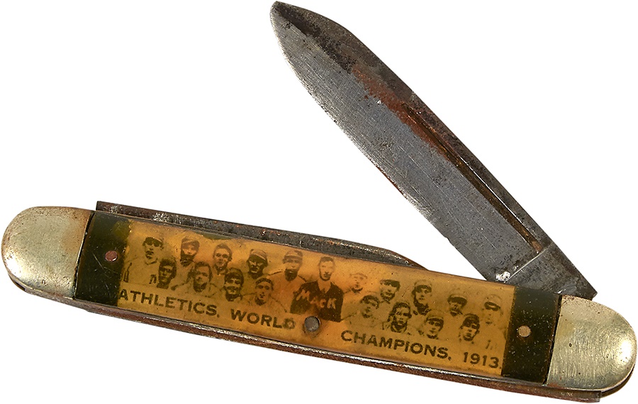 Depicted here is a marvelous image of the World Champ Philadelphia Athletics team, covered in celluloid (no, the team isn't covered in celluloid!). There is some yellowing to the celluloid on both sides and blank verso has some stress cracks.