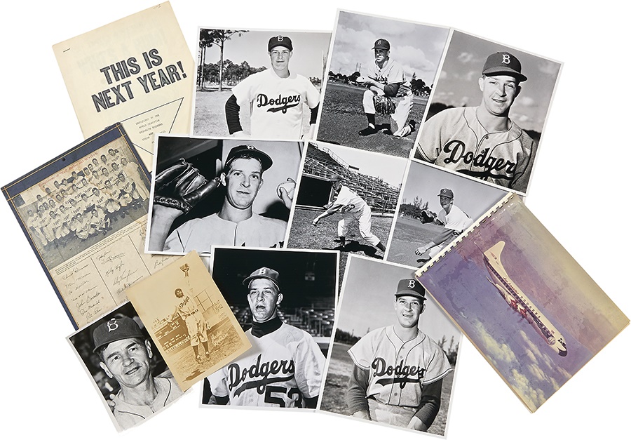 Fine group of stuff, this batch includes a 1940 Zach Wheat wire photo, Jackie Robinson 1940s premium photo, seven Karl Spooner original 4x5" negatives in original news archive envelope with set of modern prints and 8x10 copy negatives, 1960s brochure (each photo is a real photograph) for proposed LA Dodgers airplane, 1955 "This is Next Year" fanzine, and 1942 Red Barber WHN premium on unusual cloth mount.