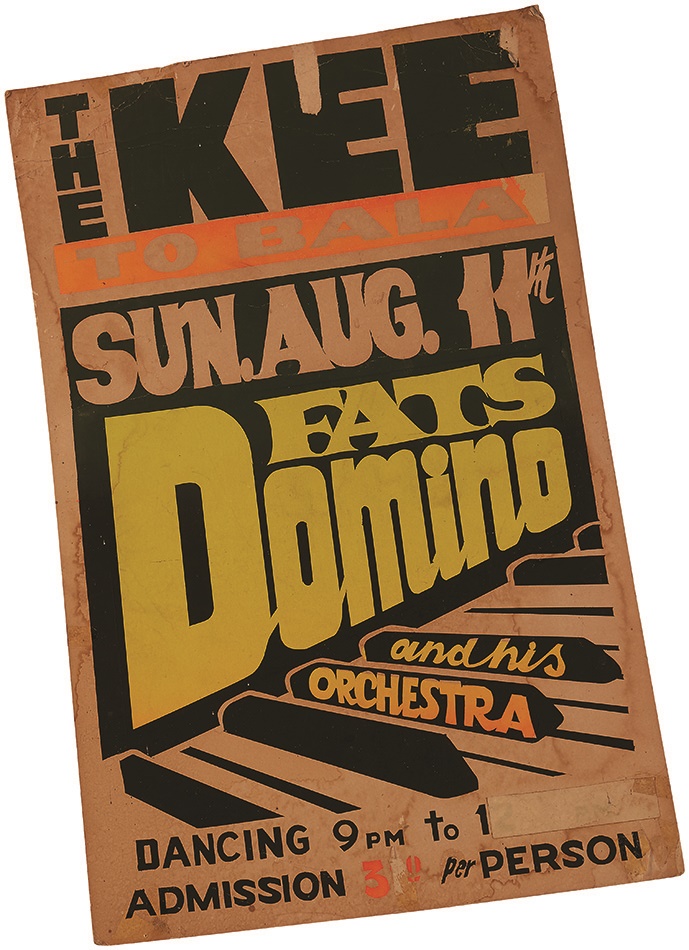 Offered here is the only known specimen of this Ontario, Canada, poster from the absolute prime of Fats Domino's career. Interestingly this has peel-on lettering in dayglo silkscreen. Measures 14" x 22" with wear as shown on cardboard. Has creasing and some paper loss.
