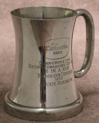 Gift from Dodgers' sponsor Schaefer Beer makes note of the former, and was presented to all the members of this unforget-table squad. Engraving reads, "Schaefer Beer, Commemorating Record Smashing Get-Away 10 In A Row, Brooklyn Dodgers, 1955, Jackie Robinson." Pewter vessel stands 5.5" tall, and is in EX condition. LOA from Rachel Robinson.