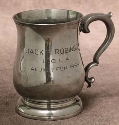 Presented to Jackie at an Alumni event in 1964. Engraved, "Jackie Robinson U.C.L.A. Alumni Fun 1964." Bottom is engraved "Williamsburg Restoration Pewter." 5" tall. EX.