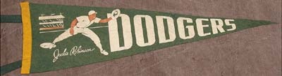 Rare pennant is the only one we have seen of this style. Impressive image of Jackie in the field shows him as a Brooklyn Dodger first baseman. His rookie year of 1947 was the only year he played there exclusively -- hence, the rarity (added with the fact that this was only distributed in black neighborhoods). Most of the Jackie Robinson mer-chandising you see is from 1949 (his MVP year). This pen-nant is as rare as World Championships in Ebbets (only one). NRMT, 22" long, not counting the tassels.